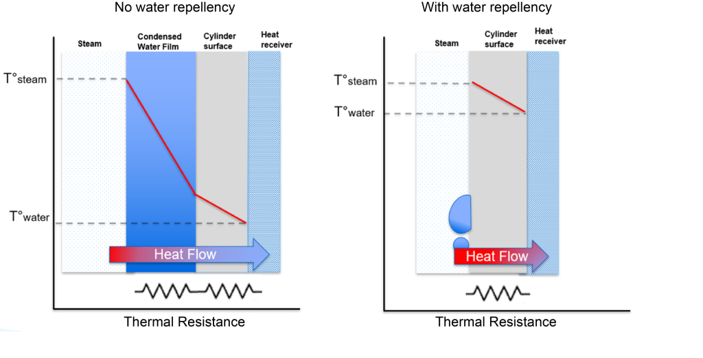 Wasserabweisung ändert den Kondensationsmechanismus von natürlicher (filmweiser Kondensation) zu tropfenweiser Kondensation und verhindert, dass Wasser eine Isolierschicht bildet. Das Ergebnis ist eine deutliche Verbesserung der Wärmeübertragungseffizienz, was zu einem geringeren Dampfverbrauch, weniger CO2 Emissionen und einer höheren Produktivität führt.